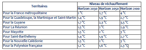 Ces niveaux de réchauffement correspondent à un réchauffement mondial de 1,5 °C à l’horizon 2030, de 2 °C à l’horizon 2050 et de 3 °C à l’horizon 2100.